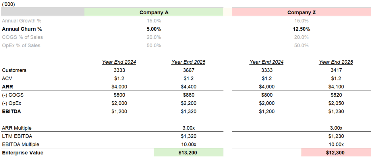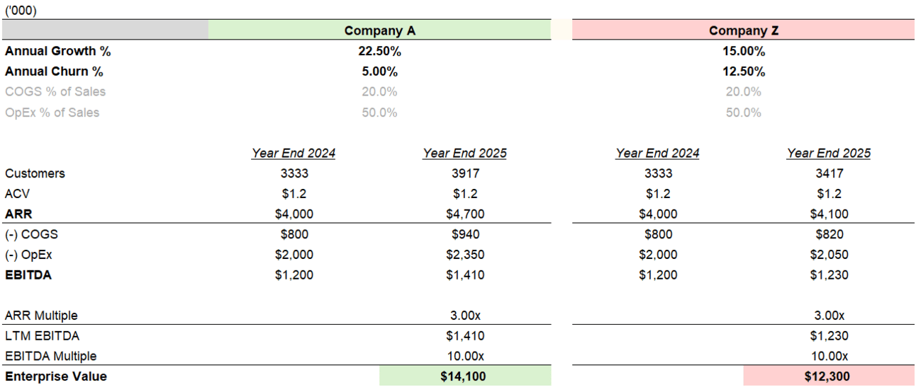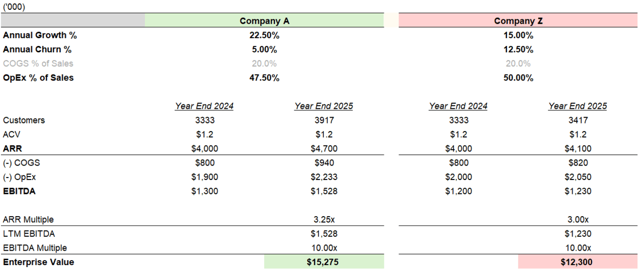 Same two businesses as before. This time, Company A implements infrastructure optimization and automates customer service requests, building on its existing retention and expansion tactics. Company Z still does nothing. By year-end, Company A’s EBITDA is about $300k higher than Company Z’s, and its enterprise value is ~$3M greater.